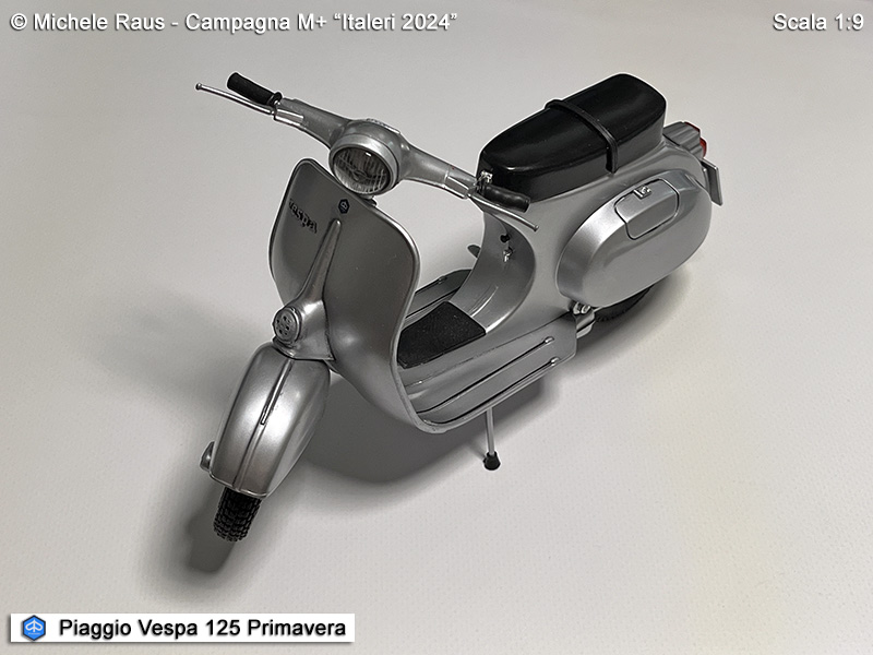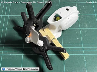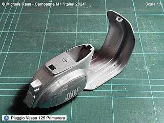devo eliminare la targa integrata che si vede nelle foto seguenti. Dopo aver ridotto la simil-targa alle dimensioni di un porta-targa, ho applicato la verniciatura finale e sono soddisfatto del risultato, sia per colore che per lucidità. In effetti, non proprio soddisfatto, perché dall'esame delle foto sopra pubblicate mi è saltato all'occhio un difetto non da poco che mi era sfuggito a occhio nudo. Si tratta di un notevole ritiro di plastica sulla parte superiore della copertura destra del motore, come si vede nella foto inferiore sinistra, tra quelle sopra pubblicate. Quindi ennesimo lavoro di ri-levigatura a cui seguirà una ripresa del colore finale grigio metallizzato. Una volta completata la verniciatura, ho potuto finalizzare il montaggio di tutto ciò che sta sotto Come già spiegato sopra, per dare un po' di realismo alla Vespa ho salvato solamente il cavalletto e quindi ho dovuto ricreare le due staffe che lo tengono attaccato al fondo, la molla che riporta il cavalletto in posizione sollevata, il meccanismo del pedale del freno posteriore, la "X" di irrigidimento e le due barre trasversali di rinforzo. Alla fine del montaggio, questo è il risultato, che purtroppo si vedrà poco, ma almeno ho la coscienza pulita. Nel frattempo ho proseguito il lavoro installando i vari accessori con piccole aggiunte e modifiche. Le uniche cose degne di nota sono le strisce gommate poggiapiedi: dopo aver provato a riprodurle con il pennello (con scarsi risultati dal punto di vista della precisione), ho deciso di ricorrere a delle striscioline di decal, che mi hanno consentito un risultato visivamente accurato e preciso. Altro dettaglio che vale la pena di segnalare è il fanale posteriore, fornito trasparente da Italeri e che ho colorato con un miscuglio di future e rosso, per ottenere la trasparenza necessaria a vedere la lampadina che ho riprodotto internamente con un bulbo creato con sprue trasparente di recupero. Per completare l'opera, ho dipinto le due viti e il bordino del catadiottro. Passiamo ora al manubrio, che sarà una delle parti più visibili a fine modello e quindi merita l'investimento di un po' di tempo nel dettaglio. Il kit offre solamente 3 pezzi, che sono il corpo del manubrio (bianco), il trasparente e la cornice cromata che fissa il vetro. In questo caso il kit Protar originale (rivisto da Italeri) era migliore, perché offriva le leve dei freni separate, e un migliore blocchetto dei comandi luci. Una cosa certamente impattante è la mancanza della calotta interna del fanale, senza la quale il vano resta visibilmente e desolatamente vuoto. Per sopperire, ho attinto alla banca dei pezzi e ho adattato allo scopo una cupolina che non ho idea da dove provenisse. La ho forata e ho aggiunto una vera lampadina, anch'essa di ignota provenienza (non butto mai nulla). Una volta cromati i pezzi e sistemata la calotta con la lampadina e quella più piccola della luce di posizione (creata con sprue trasparente), il risultato mi sembra soddisfacente. Per quanto riguarda il tachimetro, mi sento di sconsigliare l'utilizzo della parte cromata 31G, perché di dimensioni sproporzionate. Osservando le voto in dettaglio che si trovano in rete, conviene senz'altro utilizzare solamente la zona già identificata sulla superficie del manubrio e applicarvi la decal. Da notare che la decal offerta dal kit è decisamente poco somigliante al vero tachimetro. Quindi ho deciso di rielaborare una foto presa dalla rete e riadattarne il contenuto allo spazio riservato sul manubrio. Una volta ritagliato il tachimetro, l'ho incollato in posizione e lo ho coperto con abbondante Synthaglass, che, una volta asciutto, ricrea la calotta bombata trasparente. Consiglio anche di ridurre molto la profondità del blocchetto cromato dei comandi (pezzo 25G), perché la profondità sarebbe decisamente sproporzionata. Il risultato finale mi sembra soddisfacente. Le parti meccaniche e di movimento sono ben dettagliate e i colori delle stampate consentirebbero tutto sommato un montaggio senza ricorrere a pennello o aerografo. Io ho deciso di colorare tutti i pezzi, per ottenere la differenziazione tra le parti, che si nota in molte foto della Vespa. Inoltre, il lavaggio a olio è molto più semplice sul colore. Il retrotreno non presenta particolari problemi di assemblaggio, ma qualche attenzione è necessaria nel momento in cui si inserisce il blocco motore nella scocca, fissandolo con il perno trasversale. Infatti, per ottenere l'inclinazione corretta rispetto alla moto, ho dovuto accorciare di 1mm l'ammortizzatore posteriore (il cilindro nero che si vede sulla sinistra), Ho dovuto anche ridurre la dimensione del riscontro che si nota sulla destra del foro che ospita il perno di accoppiamento con la scocca. L'avantreno si assembla facilmente seguendo le istruzioni, ma secondo me conviene evitare di montare la molla e incollare l'ammortizzatore in posizione fissa. Abbastanza problematico l'incollaggio del parafango, che va studiato bene e modellato per fare in modo che alla fine sia allineato con la ruota. Sui cerchi delle ruote consiglio di stuccare i segni degli estrattori, che chiaramente non esistono sull'originale. La targa è un "progetto nel progetto". Inizialmente pensavo di cavarmela utilizzando il pezzo cromato offerto dal kit (a onor del vero un po' semplicistico), su cui incollare una stampa della targa riprodotta da me con CorelDraw. Poi però il buon enrico63 mi ha amichevolmente proposto di realizzare la targa in 3D e quindi mi sono buttato nell'impresa. Poi ho realizzato il porta targa con le viti e la grafica della targa trentina in rilievo. La stessa grafica mi è servita anche per la decal da applicare sulla stampa 3D. A sinistra i prodotti della stampa decal e resina, mentre a destra il risultato dell'accoppiamento. Dopo gli ultimi dettagli, tra cui le scritte "vespa" davanti e